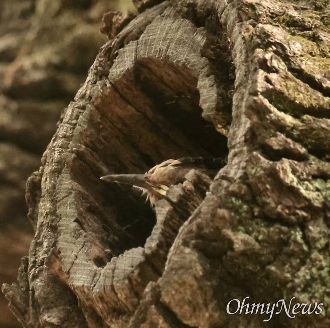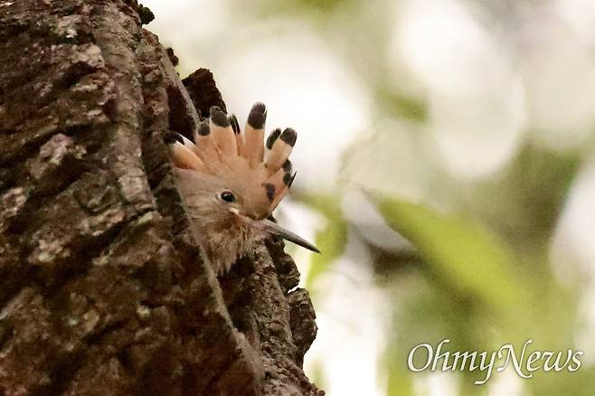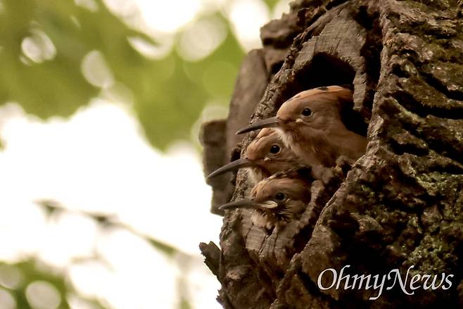 상림숲 고목에 후투티가 둥지를 튼 사실은 4월 23일 첫 발견되었다. 새끼 세 마리가 한 달만에 성큼 성장한 것이다. 어린 후투티는 조만간 이소할 것으로 보인다.