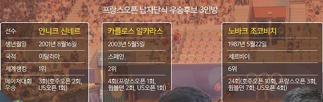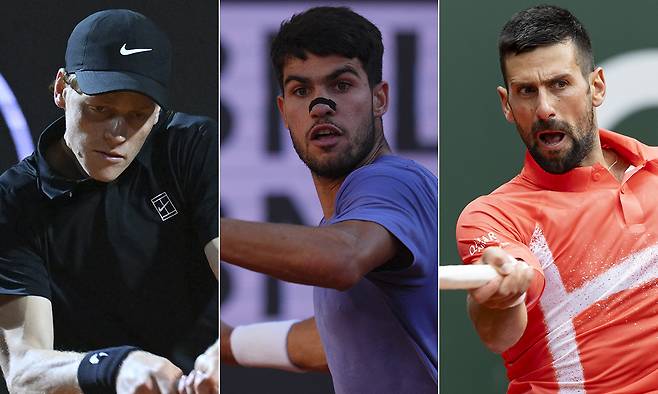 나달 없는 프랑스오픈이 25일 프랑스 파리의 롤랑가로스에서 막을 올리고 2주간 열전을 벌인다. 남녀 단식 우승상금 255만유로(약 39억7000만원)를 포함해 총상금이 5635만유로(약 884억7000만원)에 달한다. 특히 남자 단식에서 ‘흙신’ 왕좌 자리를 놓고 세계랭킹 1위 얀니크 신네르(24·이탈리아)와 ‘디펜딩 챔피언’이자 랭킹 2위 카를로스 알카라스(22·스페인), ‘살아 있는 전설’인 6위 노바크 조코비치(38·세르비아)의 3파전이 될 것이라는 전망이 우세하다.
