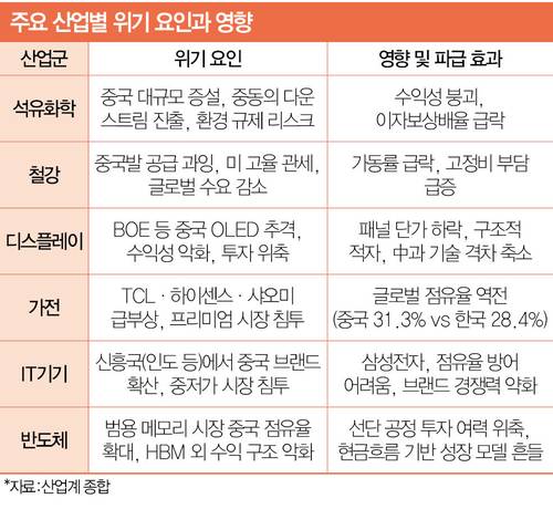 우리 경제가 사실상 ‘제로 성장’의 어두운 터널로 진입한 가운데 한때 세계 시장을 휩쓸던 주력 산업 성장 엔진도 꺼져가고 있다. 철강·석유화학 등은 중국의 무차별적 밀어내기 공세로 신음하는 가운데 가전·반도체 업종에선 ‘레드테크’ 역습이 매섭다. 상수로 자리 잡은 중국 공세에 미증유 관세 전쟁에 따른 불확실성 증폭으로 우리 기업은 유례없는 복합 위기를 마주했다.