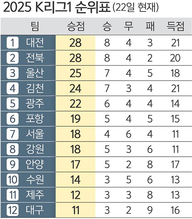 2025 K리그1에서 독주 체제를 구축했던 대전 하나시티즌이 휘청거리고 있다. 약팀을 만나도 막강한 화력이 살아나지 않는다. 대전이 최근 세 경기에서 승리를 하지 못하는 사이 명가 재건을 외치는 전북 현대와 디펜딩 챔피언 울산 HD가 매서운 기세로 선두추격에 나섰다.