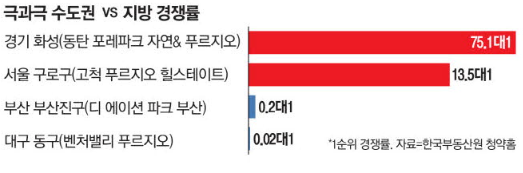 하지만 경기 ‘동탄 포레파크 자연&푸르지오’ 351가구 모집에는 2만6372명, 서울 구로구 ‘고척 푸르지오 힐스테이트’ 262가구 모집에는 3543명이 몰려 대조를 이뤘다.