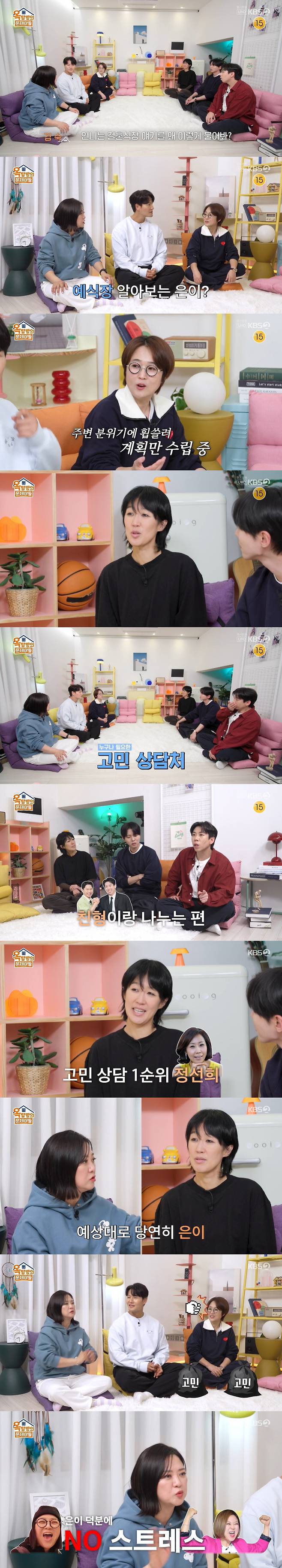 김숙은 "나는 은이 언니다"면서 "내 고민이 생기면 은이 언니한테 다 떠넘긴다. 나는 스트레스가 없다"고 해 웃음을 안겼다.