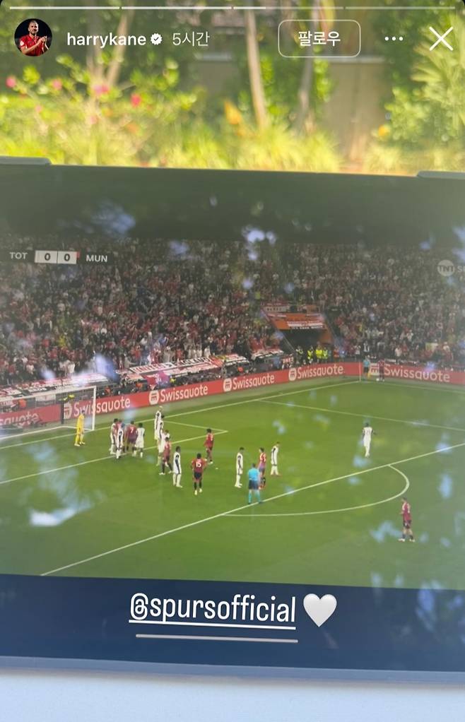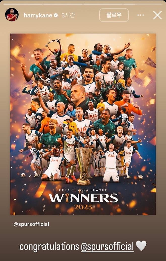 케인은 토트넘이 공개한 포스터를 자신의 스토리에 추가하며 축하한다는 인사와 함께 구단의 공식 계정을 태그했다. 또한 토트넘을 상징하는 흰색 하트를 붙이며 애정을 드러냈다.