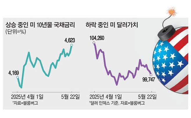22일(현지시간) 도널드 트럼프 미국 대통령의 초대형 감세법안이 미 하원 본회의를 통과하며 재정적자 확대 우려가 커지자 안전자산인 미국 국채가 추락했다. 신용평가사 무디스의 국가 신용등급 강등 후 처음으로 실시된 21일 국채 경매 수요 부진으로 불이 붙은 국채금리가 다시 상승(국채 가격 하락)한 것이다.