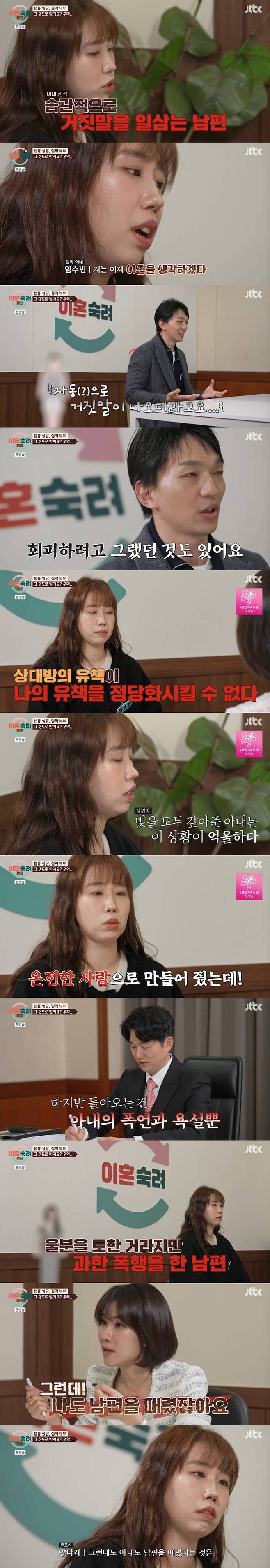 아내는 변호사에게 "결혼 전에 빚이긴 했지만 그 빚으로 인한 영향이 컸다. 결혼식만 했지 한 게 없다. 결혼반지, 프러포즈, 신혼여행이 없었다. 저는 부자로 살아보진 않았지만 거지같이 살아보지도 않았다"라며 억울해했다. 이어 "근데 남편이랑 살고 생존의 위협도 느꼈다"라며 열심히 절약해서 빚 상환도 다 했다고 전했다.