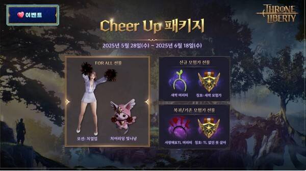 신규, 복귀 모험가와 협력 던전을 돌거나 필드 보스, 길드 레이드를 함께 돌면 포인트를 얻는다. 서버별 TOP 5 외에도 누적 보상 선물을 받을 수 있다.