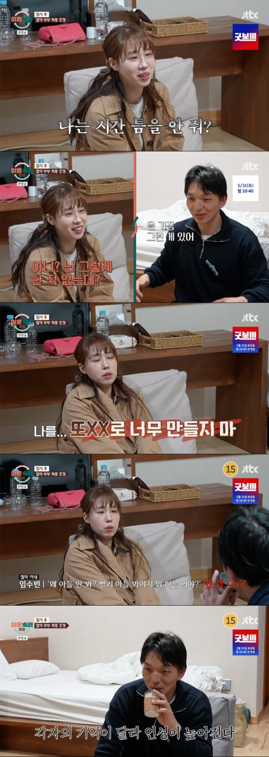 절약부부는 방으로 돌아와 이야기를 나눴고, 남편은 아내가 일을 하는 중에 다른 일을 시켜 힘들다는 말을 했다. 이를 들은 아내는 “나를 또XX로 너무 만들지마”라며 언성을 높였다.