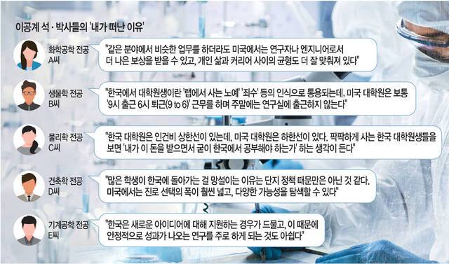 국민일보는 최근 미국에서 석박사 과정을 밟고 있는 이공계 유학생 5명을 서면 인터뷰했다. 이들은 하나같이 학위를 마친 뒤 한국에 돌아올 생각이 없다고 입을 모았다. 이들은 한국을 떠난 이유에 대해 ‘고연봉의 미국 기업에 취업하기 위해서’라기보다는 공통적으로 “내가 하고 싶은 연구를 자유롭게 하기도 어렵고, 충분한 연구비도 없는 한국보다 미국에서 공부를 하고 싶었다”고 말했다.