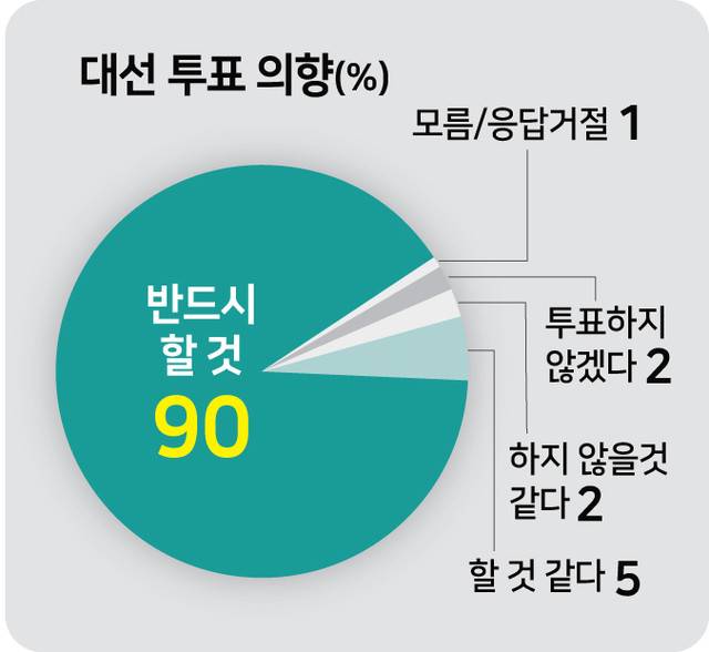대선 투표 의향을 묻는 질문에 ‘반드시 할 것’이라는 응답이 90%였고, ‘아마 할 것 같다’ 5%, ‘아마 하지 않을 것 같다’ 2%, ‘하지 않겠다’ 2%, ‘모름·응답거절’ 1% 등의 순이었다.
