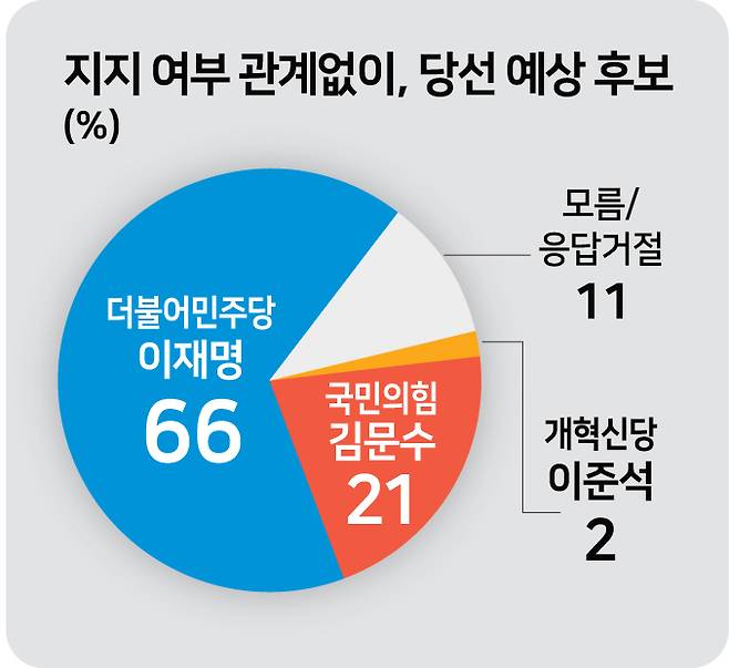 6·3 대선 당선 예상 후보와 관련, 응답자의 66%가 더불어민주당 이재명 후보의 당선 가능성이 높다고 내다봤다. 국민의힘 김문수 후보는 21%, 개혁신당 이준석 후보는 2%였고, ‘모름·무응답’은 11%였다.