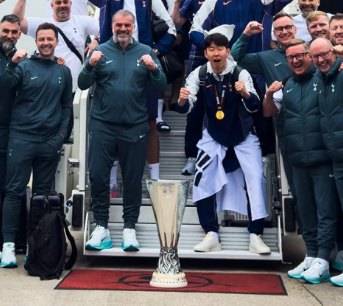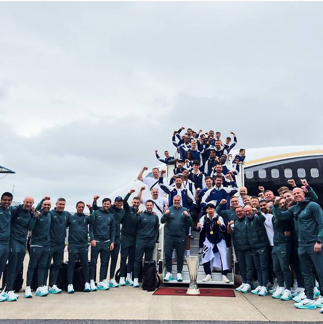 토트넘 선수들은 영국에 도착하자마자 UEFA 유로파리그 트로피와 함께 단체 사진을 찍었는데, 이때 트로피 바로 앞에 서있던 손흥민의 허리엔 여전히 태극기가 묶여 있었다.