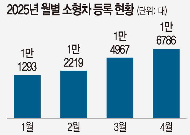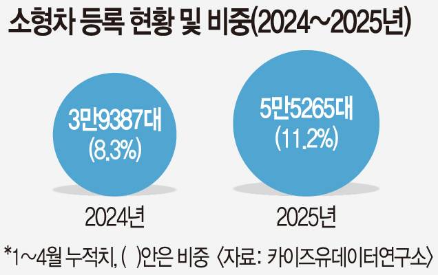 소형차 판매량은 올해 들어 매달 증가 추세를 보였다. 지난 1월 1만1293대가 판매된 데 이어 2월 1만2219대, 3월 1만4967대, 4월 1만6786대로 매달 늘었다. 지난달 판매량은 전년 동기 대비 50.7% 증가하면서, 대형차를 제치고 가장 높은 증가율을 보였다. 차급별 판매 비중도 커졌다. 2021년 이후 8~9%대로 한 자릿수에 머물러 왔던 소형차 판매 비중이 올해는 11.2%까지 올라왔다. 4년 만에 두 자릿수 점유율이다.