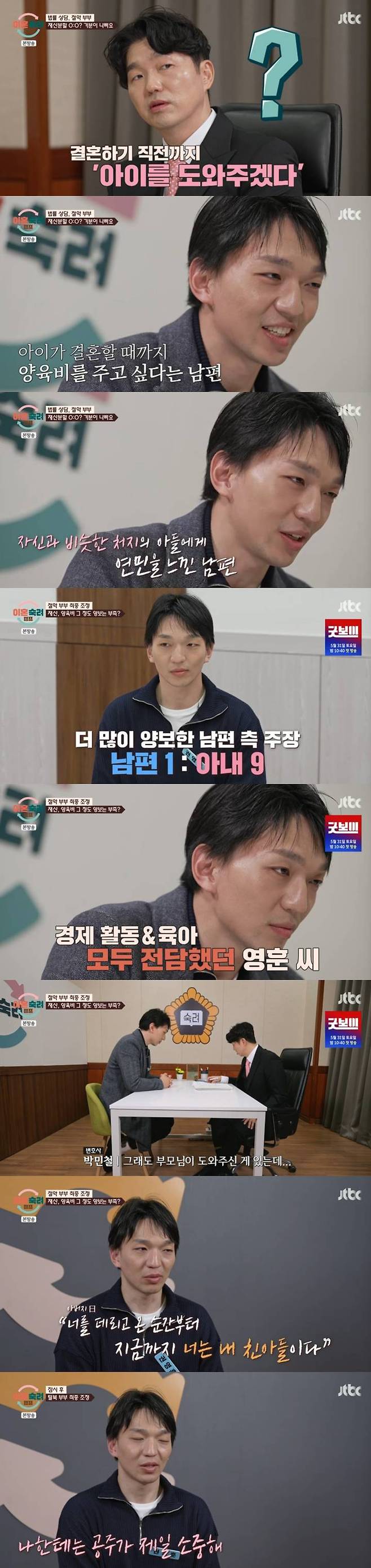 "아내가 결혼할 때까지?"라는 물음에 "아이가 결혼할 때까지요"라고 전해 놀라움을 안겼다. 변호사는 "네? 무슨 소리냐. 콘셉트냐"라며 믿지 못했고, 남편은 "아내와 아이를 보면 저와 엄마가 생각나더라"라고 말했다.