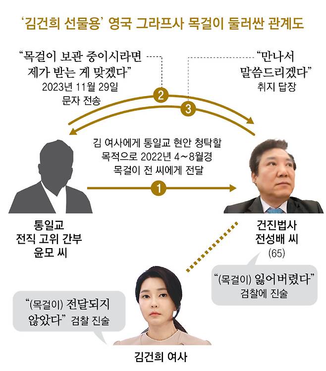 윤 씨가 전 씨에게 “목걸이를 돌려달라”고 한 시점은 김 여사가 최재영 씨로부터 300만 원 상당의 디올백을 받는 영상이 공개된 지 이틀 뒤였다. 디올백 사건으로 영부인 뇌물 수수 의혹이 커지자 윤 씨가 부담을 느껴 목걸이 반납을 요구했다는 관측도 제기된다.