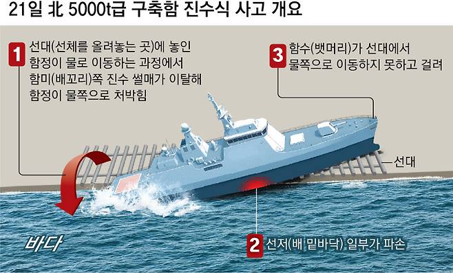 잠수함 함장 출신인 문근식 한양대 공공정책대학원 특임교수는 “함수와 함미 쪽 레일이 부실했던 것으로 보인다. 진수 과정에서 배가 파손되는 건 굉장히 드문 사고”라며 “김 위원장이 직접 해군력 현대화를 계속 강조해왔던 상황에서 무리하게 진수식 날짜를 맞추려다 보니 안전 절차 등이 부실하게 준비된 것 같다”고 분석했다.