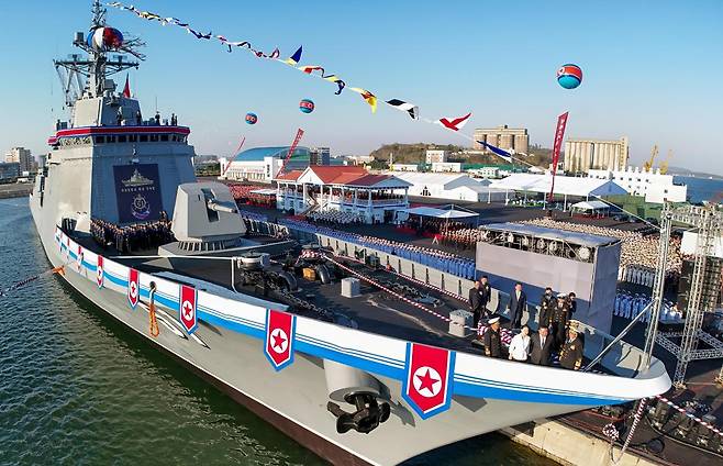 | 사고 구축함과 동급인 구축함 북한 조선중앙통신은 21일 청진조선소에서 새로 건조한 5000t급(최현호) 구축함 진수식을 진행하다가 사고가 발생했다고 보도했다. 사고 구축함과 동급의 신형 구축함 모습. 노동신문 뉴스1 |