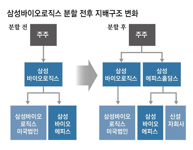여기에 삼성전자, 삼성물산 등 그룹 내 주요 기업들의 주가 부진도 이번 분할의 배경이 됐다는 해석도 있다. 삼성물산과 삼성전자는 각각 삼성바이오의 지분을 43.06%, 31.2% 보유한 최대 주주다. 업계에서는 이번 분할을 통해 성장성이 큰 삼성바이오와 삼성에피스를 수평적으로 지배할 수 있게 된 삼성물산 및 삼성전자의 지분가치가 오를 수 있다고 보고 있다.
