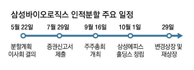 홀딩스는 10월 1일 창립될 예정이며, 10월 29일 삼성바이오의 변경 상장과 홀딩스 재상장을 추진할 계획이다. 이번 분할로 기존 삼성바이오 주주는 삼성바이오 주식과 홀딩스 주식을 0.65 대 0.35 비율로 받게 된다.