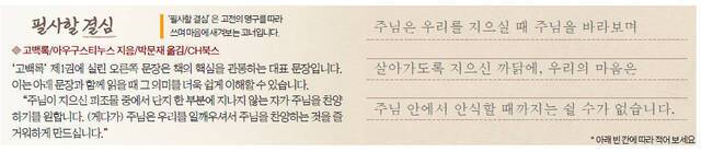 ‘톨레 레게’(라틴어로 ‘들고 읽어라’란 뜻)로 유명한 아우구스티누스의 회심에서도 배울 점이 많습니다. 그는 정원을 걷다 이웃집에서 들려오는 말소리를 듣고 성경을 펼치는데요. 첫눈에 들어온 이 구절을 읽은 뒤 즉시 회심합니다. “…방탕하거나 술 취하지 말며 음란하거나 호색하지 말고…오직 주 예수 그리스도로 옷 입고 정욕을 위해 육신의 일을 도모하지 말라.”(롬 13:13~14)