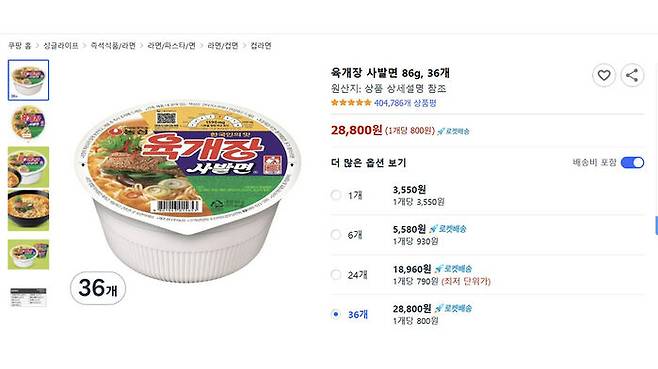 유통업계에 따르면 그제(21일) 오후 11시쯤 쿠팡 판매사이트에 육개장 사발면 36개들이 상품이 5천40원에 노출됐습니다.