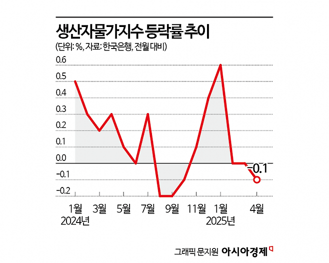 23일 한국은행이 발표한 '2025년 4월 생산자물가지수(잠정)'에 따르면 지난달 생산자물가지수는 120.24(2020년 100)로 전월 대비 0.1% 하락했다. 지난해 10월 0.1% 내린 후 6개월 만의 마이너스 기록이다. 지난해 10월 이후엔 11월(0.1%), 12월(0.4%)에 이어 올해 1월(0.6%)까지 오름세를 이어오다 2월과 3월 각각 보합(0.0%)에 머물렀다. 4월 생산자물가지수를 지난해 같은 기간과 비교하면 산업용 전력, 정보통신 및 방송서비스를 중심으로 0.9% 올랐다.
