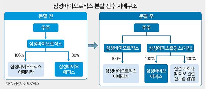 기업 분할은 주주가 기존법인(삼성바이오로직스)과 신설법인(삼성에피스홀딩스)의 주식을 지분율에 비례해 나눠 갖게 되는 인적분할 방식으로 진행된다. 분할 비율은 현재 순자산 장부가액을 기준으로 정해졌다. 이에 따라 삼성바이오로직스의 기존 주주는 삼성바이오로직스 주식과 삼성에피스홀딩스 주식을 ‘0.6503913 대 0.3496087’의 비율로 받게 된다.