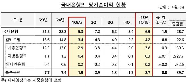 금융감독원은 오늘(23일) 1분기 국내은행 당기순이익이 6조9천억원으로 지난해 1분기(5조3천억원)보다 28.7% 증가했다고 밝혔습니다.