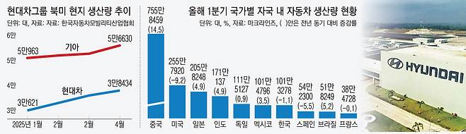 현대차 기업공개(IR) 자료에 따르면 지난해 말부터 생산을 시작한 메타플랜트의 가동률은 57% 수준까지 올라온 상태다. 이곳의 올해 1분기 아이오닉5 생산량도 글로벌 판매량의 절반 수준인 1만1033대에 달했다. 메타플랜트는 수년 안에 가동률 100%를 넘어 연간 생산 규모를 20만대가량 더 끌어올린다는 계획이어서 국내 공장 생산 물량의 미국 이전 현상은 더 가속화할 공산이 크다.