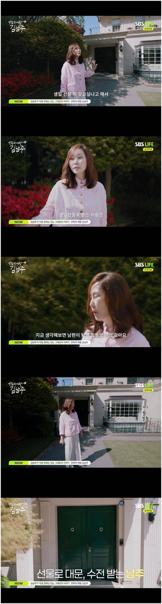 그러면서도 프랑스에서 온 수전, 8개월 걸려 공수한 초록빛 대문은 모두 김승우의 선물이라고 밝힌 김남주. 김남주는 “그래서 저는 이 집이 저한테 의미가 있고, 결혼하면서부터 20년 간 아이들 낳고 살면서 타일도 깨지는 것도 있고, 주택이다 보니까 가꾸어야 하고 손도 많이 가지만, 이사 가는 것보다 정원을 즐길 수 있는 게 너무 행복하다”라고 말했다.
