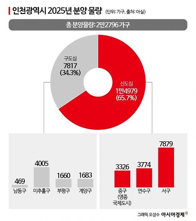 올해 인천의 분양 물량도 대부분 신도심에 집중됐다. 인천의 신규 아파트는 2만2796가구로 이 중 65.7%(1만4979가구)가 신도심인 경제자유구역(중구 ·연수구 ·서구)에 공급될 전망이다. 건설업계 관계자는 "땅값이 저렴한 택지를 사들여 신축 아파트를 대량 공급하면 많은 이익을 남길 수 있다"며 "정비사업보다는 쉬운 작업"이라고 설명했다.