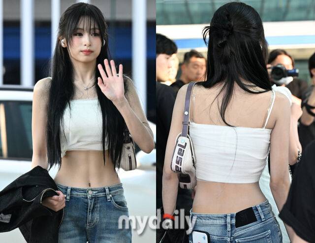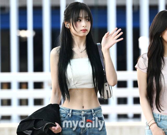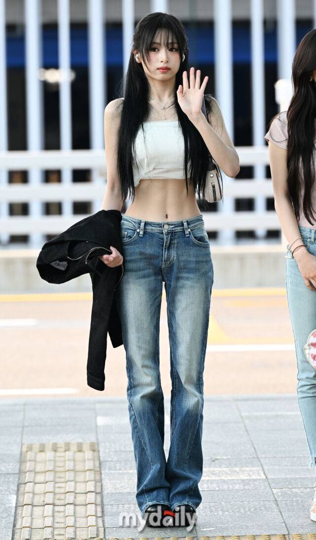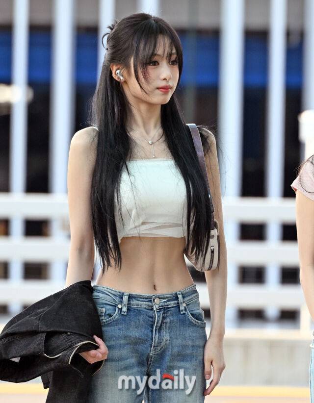 아현은 데님에 화이트 슬리브리스 크롭 티로 슬림한 허리라인을 드러낸 패션을 선보였다. 특시 그림자까지 질 정도의 선명한 복근은 시선을 사로잡았다.