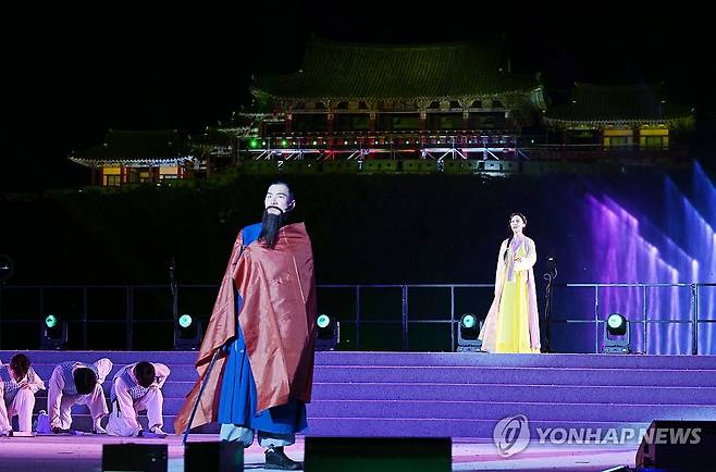 (밀양=연합뉴스) 지난 22일 오후 경남 밀양시 밀양강 특설무대에서 제67회 밀양아리랑대축제의 메인 행사인 밀양강 오딧세이 '칼을 품고 슬퍼하다' 공연이 진행되고 있다.