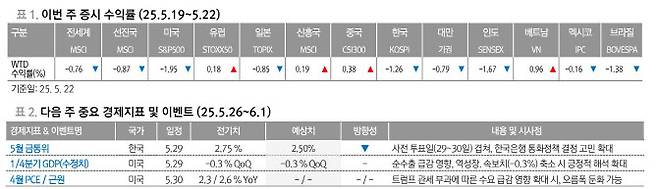 현재 미국 증시는 2023년 10월 말 이후 경기, 이익을 바탕으로 한 펀더멘탈 장세가 지속 중이다. 트럼프 관세 부과로 소비지출 둔화가 일부 4월 경제지표에서 나타나고 있지만, 2022년 2분기 이후 실질성장률이 잠재성장률을 상회하고 있는 현 경제 상황은 소비 절벽을 통한 현 미국 경기 확장 국면을 쉽게 훼손시키기 어렵다는 것이 문 연구원의 해석이다.
