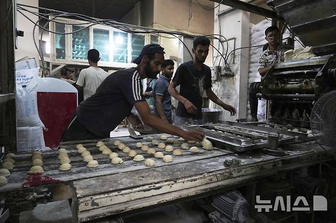 [데이르알발라=AP/뉴시스] 22일(현지 시간) 이스라엘이 일부 구호물자의 가자지구 반입을 허용함에 따라 세계식량계획(WFP)이 밀가루를 들여오자, 데이르알발라에서 팔레스타인 주민들이 빵을 굽고 있다. 2025.05.23.