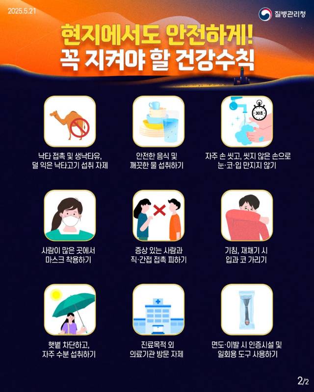 울산시 관계자는 “중동지역 방문자는 귀국 후 2주 이내 증상이 발생하면, 의료기관을 직접 방문하지 마시고 질병관리청 콜센터 또는 보건소로 즉각 연락해 주시길 당부드린다”라고 말했다.