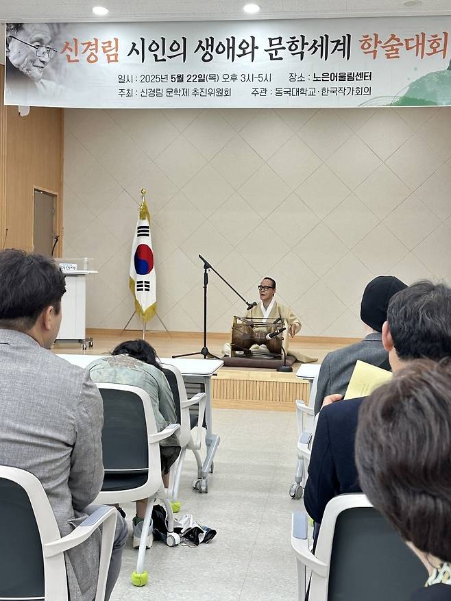 식전 행사로, 신경림 시인과의 인연으로 고향 충주에서 국악을 전파하고 있는 권재은 명창이 20분 동안 시절가인 <육칠월>과 신 시인이 좋아하던 사설 <통일 비나리>를 불렀다.