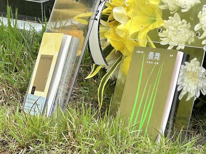 | ▲ 묘소 앞에 헌정된 유고시집 <살아있는 것은 아름답다>와 <농무> |