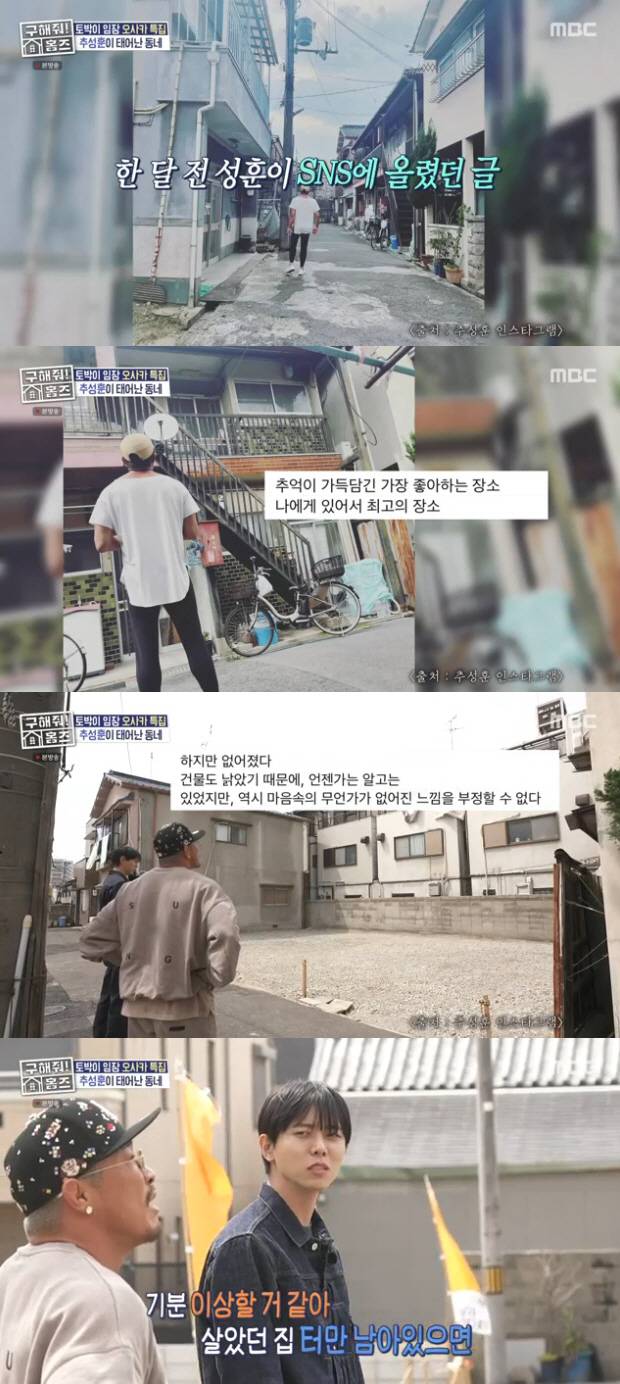 이후 두 사람은 철거가 돼 공터가 된 추성훈의 고향 집터에 도착했다. 앞서 이미 추성훈은 어린시절 살았던 집이 철거됐다는 소식을 전한 바 있다.
