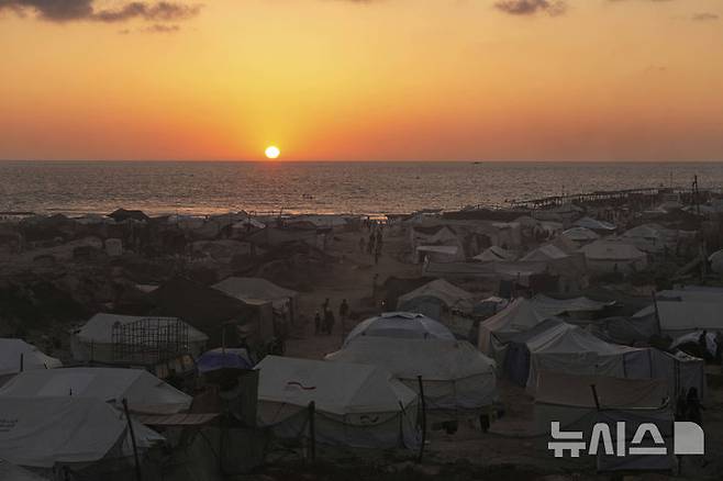 [가자시티=AP/뉴시스] 22일(현지 시간) 가자지구 가자시티 항구를 따라 조성된 팔레스타인 피란민들의 천막촌 뒤로 해가 지고 있다. 2025.05.23.