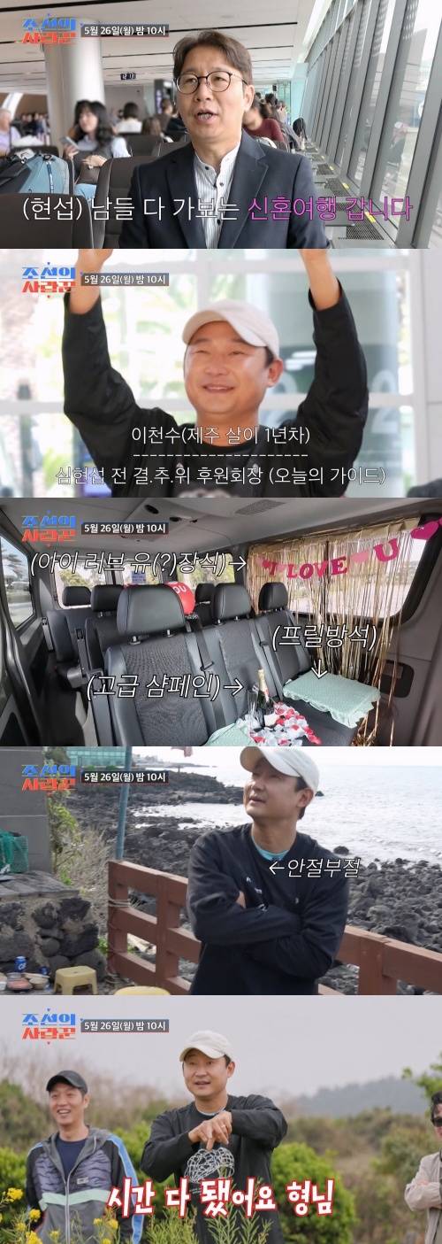 26일(월) 방송될 ‘조선의 사랑꾼’에서는 제주도로 신혼여행을 떠나기 위해 공항에 도착한 심현섭♥정영림이 포착된다. 설렌 맘을 안고 비행기에서 내린 그들을 맞이한 건 '제주살이 1년 차' 이천수였다. 전직 '심현섭 결혼 추진 위원회' 후원회장이었던 이천수가 '혼저옵서예' 플래카드를 들고 마중 나오자, 사랑꾼 MC들은 "미리 가 있었던 거냐"며 화들짝 놀랐다.