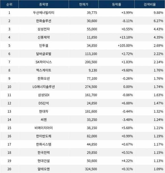 이어 한화솔루션(009830)이 검색비율 2위를 기록하며 8.11%의 하락세를 기록하고 있다. 검색비율 3위의 삼성전자(005930)는 0.55% 상승하며 보합권에 머물고 있다. 검색비율 4위 신풍제약(019170)은 개장 초반부터 13.18%의 급등세를 보이고 있다. 검색비율 5위 인투셀(287840)은 105.00%의 폭등세를 보이며 시장을 놀라게 하고 있다.