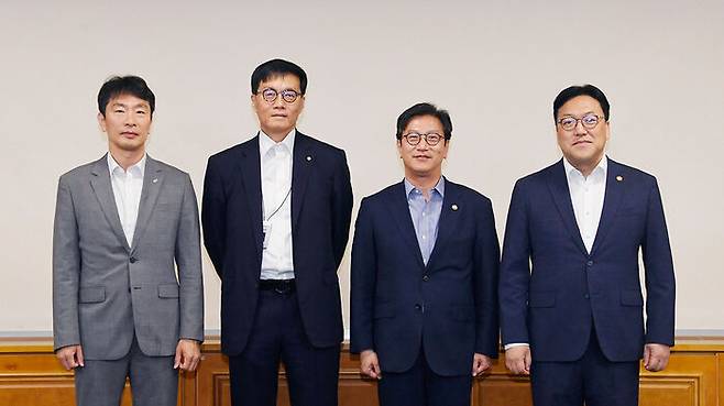▲ 김범석 기획재정부 장관 직무대행 1차관이 23일 서울 중구 은행회관에서 열린 '거시경제·금융현안 간담회' 시작에 앞서 기념 촬영하고 있다. 왼쪽부터 이복현 금융감독원장, 이창용 한국은행 총재, 김범석 직무대행, 김병환 금융위원장.