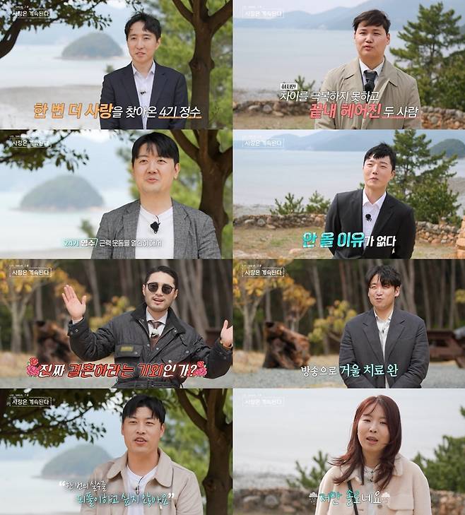 가장 먼저 등장한 4기 정수는 “연애와 결혼을 시도해봤지만 잘 되지 않아서 다시 나오게 됐다”고 밝힌 뒤, “쌍수를 했다”는 TMI를 덧붙였다. 뒤이어 23기 영호가 나타났고, 그는 “(최종 커플이 됐던 23기 현숙과) 그릇이 서로 다르다는 걸 알았다”며 결별 사실을 고백한 뒤 새로운 사랑을 찾으러 왔음을 알렸다.
