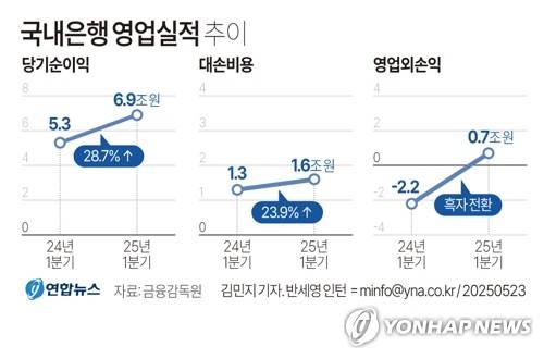 (서울=연합뉴스) 김민지 기자 = 금융감독원이 23일 발표한 '2025년 1분기 국내은행 영업실적'에 따르면 올해 1분기 국내은행의 당기순이익은 6조9천억원으로 작년 동기(5조3천억원) 대비 1조5천억원(28.7%) 증가했다.