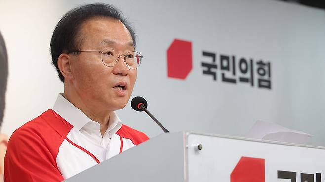 ▲ 국민의힘 윤재옥 중앙선대위 총괄선거대책본부장이 23일 서울 여의도 국민의힘 중앙당사에서 기자간담회를 하고 있다.