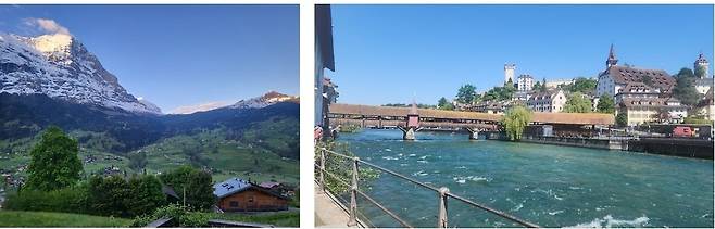 | ▲ 유럽의 지붕 스위스 융프라우 (좌)그린델발트에서 촬영한 융프라우 (우)스위스 루체른에 있는 유럽에서 가장 오래된 목조다리 가펠교 |
