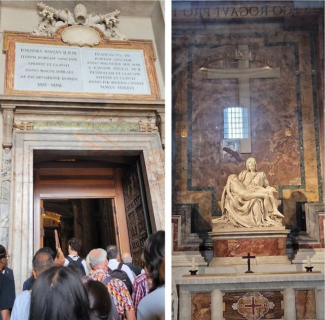 | ▲ 성 베드로 대성당에서 꼭 관람해야 하는 것 (좌)25년만에 열리는 성스러운 문 (우)미켈란젤로의 '피에타' |