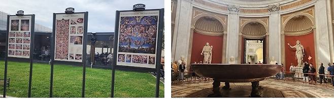 | ▲ 작품 설명판과 바티칸 박물관의 원형 전시관 성당 피냐 정원 여러 곳에 작품 설명판이 설치되어 있고, 바티칸 박물관의 여러 방들 중 원형 전시관의 네로의 욕조와 신들의 조각상 |