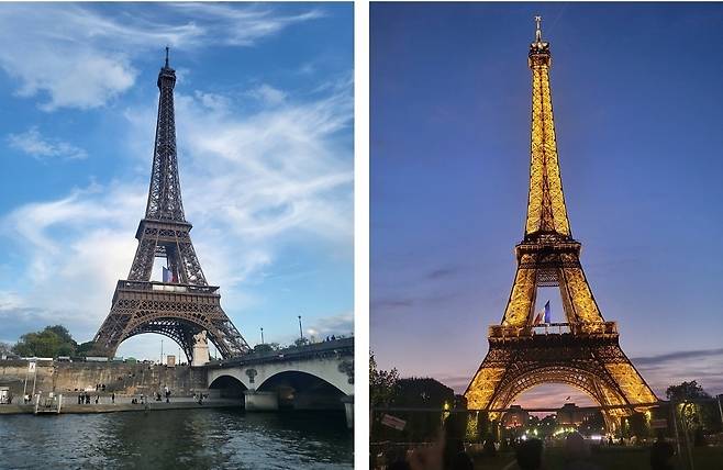 | ▲ 프랑스 파리 에펠탑 (좌)센강 유람선에서 낮에 촬영한 에펠탑 (우)밤에 촬영한 에펠탑 야경, 5월 8일이 전승 기념일이라 프랑스 국기가 걸려있다. |