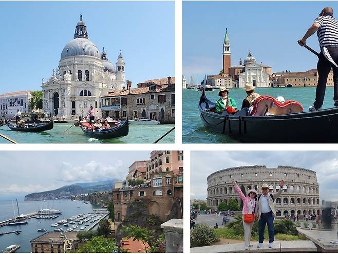 | ▲ 이탈리아 여행지 (위)베니스에서 곤돌라를 타고 운하를 누비는 모습 (아래)이탈리아 소렌토와 로마의 콜로세움 |